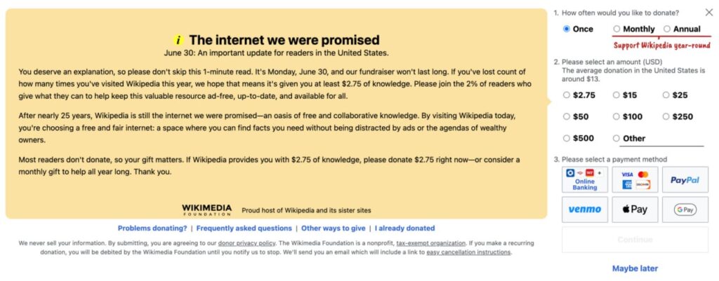 Первые баннеры с просьбой поддержать платформу содержали фото хорошо известного основателя Википедии Джимми Уэлса с его обращением к читателям. Со временем формат поменялся. Слова Уэлса заменили на обращение фонда. А на баннерах разместили способы оплаты и варианты подписки – чтобы пользователи могли ознакомиться с возможными способами поддержки, не открывая новую страницу.